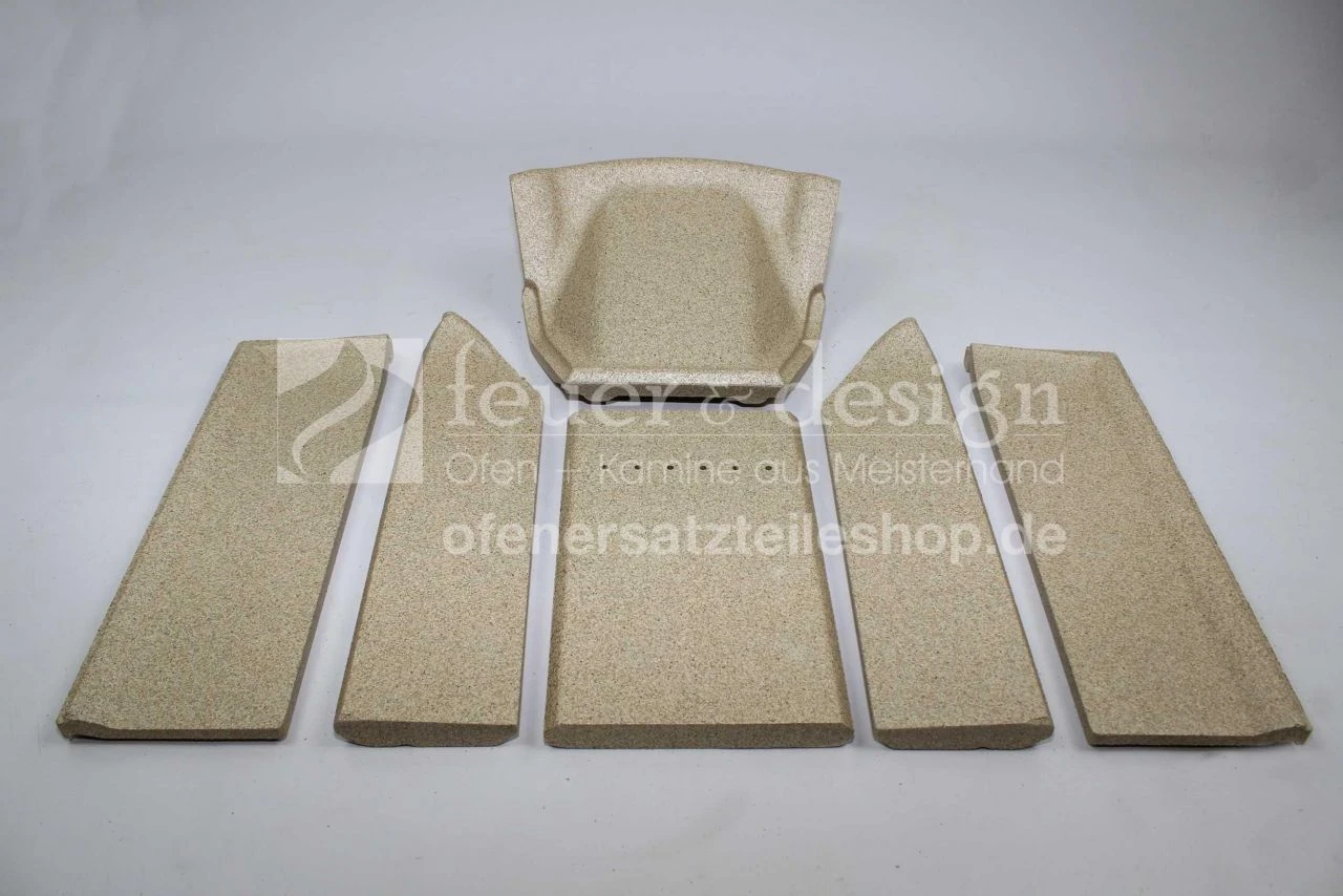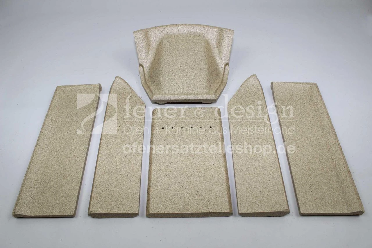 Der 6-teilige Satz Brennraumauskleidung beinhaltet die seitlichen Hitzeschutzplatten vorne links und rechts, seitlichen Hitzeschutzplatten hinten links und rechts, die hintere Hitzeschutzplatte/Rückwand und die Rauchumlenkplatte.