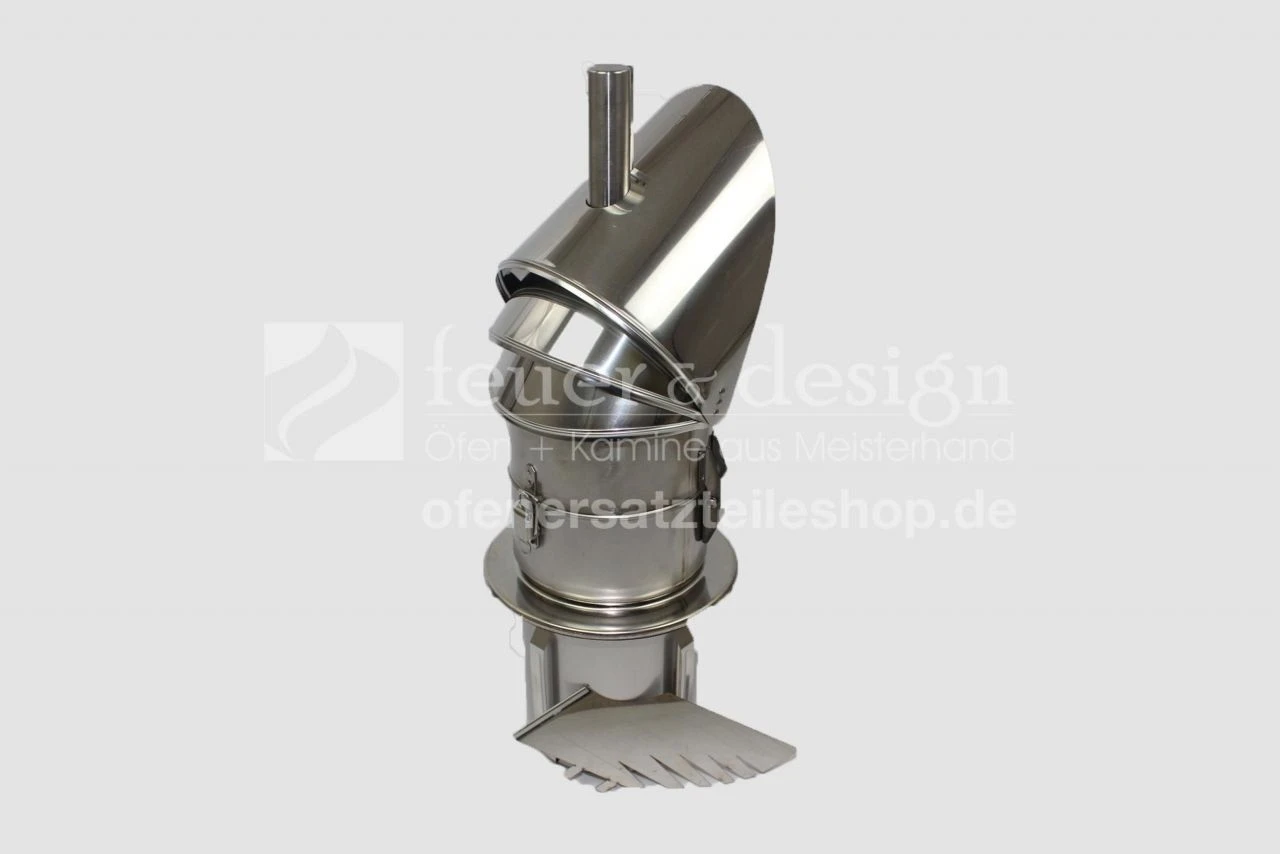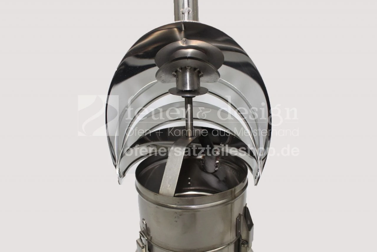 Der Schornsteinaufsatz dreht sich wie ein Wetterhahn im Wind und hält Temperaturen bis 500° C Stand.
