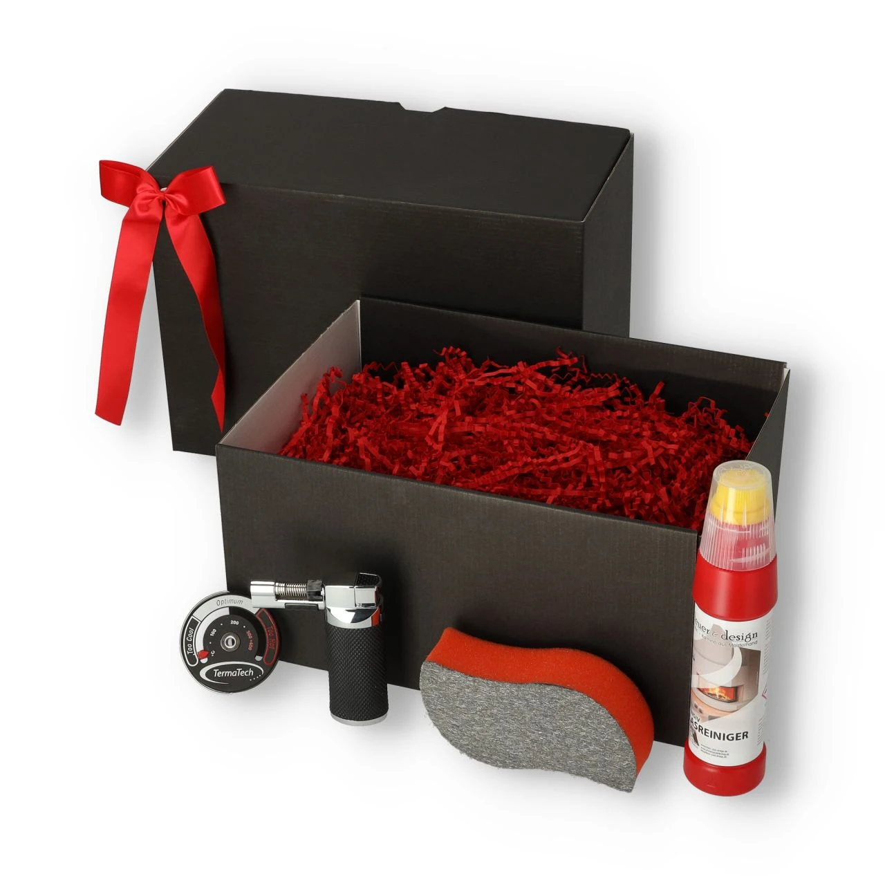 Kamin Geschenkset Rauch & Flamme in edler Verpackung mit Glasreiniger + Thermometer + Feuerzeug + Trockenreinigerschwamm